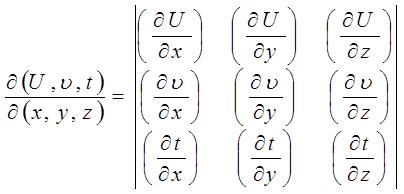который раскрывается как определитель третьего порядка. Для систем с четырьмя независимыми переменными, якобиан раскрывается как определитель четвертого порядка и т. д.