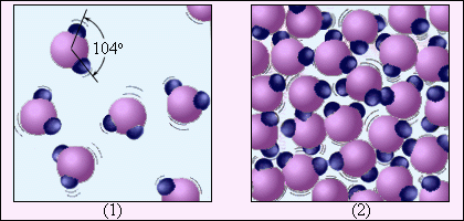 Рис. 2 иллюстрирует отличие газообразного вещества от жидкости на примере воды. Молекула воды H2 O состоит из одного атома кислорода и двух атомов водорода, расположенных под углом 104°. Среднее расстояние между молекулами пара в десятки раз превышает среднее расстояние между молекулами воды. В отличие от рис. 3.5.1, где молекулы воды изображены в виде шариков, рис. 3.5.2 дает представление о структуре молекулы воды.