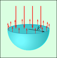 Из-за действия сил поверхностного натяжения в каплях жидкости и внутри мыльных пузырей возникает избыточное давление Δp. Если мысленно разрезать сферическую каплю радиуса R на две половинки, то каждая из них должна находиться в равновесии под действием сил поверхностного натяжения, приложенных к границе 2πR разреза, и сил избыточного давления, действующих на площадь πR2 сечения (рис. 4). Условие равновесия записывается в виде
