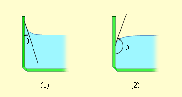| Рисунок 5. Краевые углы смачивающей (1) и несмачивающей (2) жидкостей. |