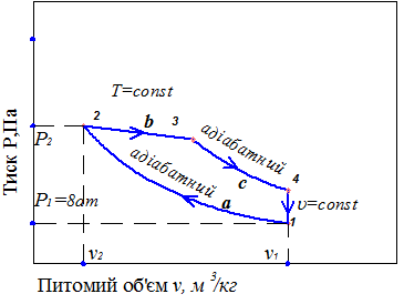 Визначити годинні витрати теплоти і палива для здійснення циклу. Побудувати цикл на міліметровому папері у масштабі у координатах P - V і T - S. Дати рекомендації з підвищення ККД циклу і зменшенню витрат палива на його здійснення.