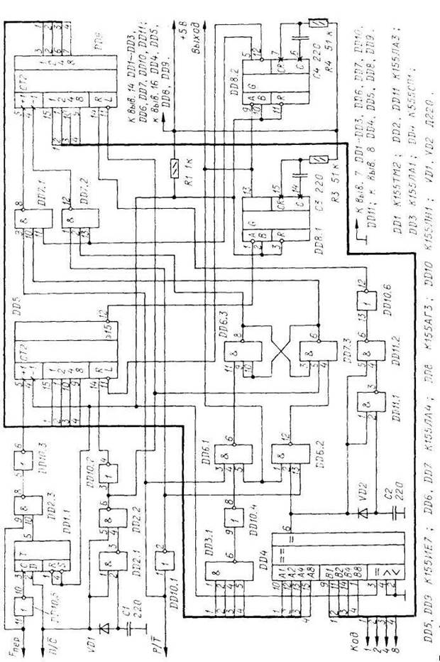 Нулевое состояние этого счетчика в каждом цикле будет записываться в счетчик DD5 и на выход блока начнут поступать импульсы с частотой Fпер/15— так завершается этап торможения ротора электродвигателя. При одновременном изменении сигнала на входах П/С_(с высокого на низкий уровень) и Р/Т (с низкого на высокий) заканчивается режим вращения ротора. Низкий уровень сигнала со входа П/С разрешает установку триггера синхронизации DD1.1 в нулевое состояние, что блокирует прохождение импульсов Fпер, на вход +1 счетчика DD5 и соответственно приводит к отсутствию импульсов на выходе блока. При очередной смене уровней напряжения на входе П/С запуск электродвигателя с этапами разгона и торможения ротора повторится. Расчет времени разгона можно выполнить по формуле tраз = 0,5Тпер [30+(16+К)(15-К)], а времени торможения: tтор = 0,5Тпер (16+К) (15-К). Время разгона можно изменять от 135Тпер до 15Тпер , а время торможения — от 120Тпер до 0. Максимальное значение времени соответствует коду 0000, а минимальное — 1111. В блоке можно использовать микросхемы серий 155, 555, 1533 исполнений К, КР, КМ. Диоды — любые низковольтные импульсные. Емкость конденсаторов СЗ и С4, указанная на схеме, соответствует максимальному значению частоты Fпер — 50 кГц. Рисунок 1. Данная статья бала позаимствована из Журнала радио №7 2005 страницы 38-39 которая бала разработана В. Демонтович, город Киев, Украина.