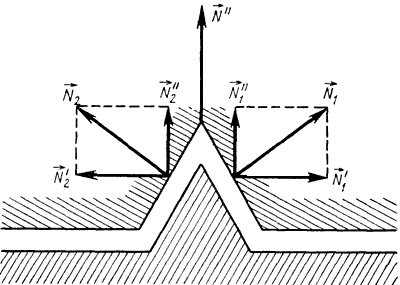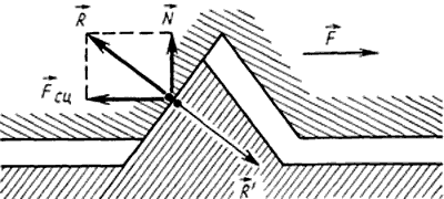Рассмотрим взаимодействие соприкасающихся тел на примере одной пары неровностей (гребень и впадина) (рис. 3, б). В случае, когда сила, пытающаяся вызвать движение, отсутствует, характер взаимодействия на обоих склонах микронеровностей аналогичный. При таком характере взаимодействия все горизонтальные составляющие силы взаимодействия уравновешивают друг друга, а все вертикальные просуммируются и составляют силу N (реакция опоры) (рис. 2, а).