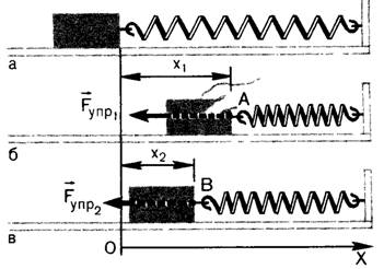 Вычислим работу, совершаемую силой упругости при изменении деформации (удлинения) пружины от некоторого начального значения x1 до конечного значения x2 (рис. 4, б, в).