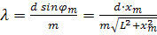 Обозначим расстояние между серединой нулевого максимума и максимумами 1,2, ... m- го порядков, соответственно, х1 х2 ... хт а расстояние между плоскостью дифракционной решетки и экраном -L. Тогда синус угла дифракции