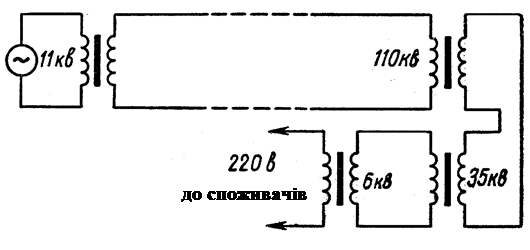Для безпосереднього використання електроенергії в двигунах електропривода верстатів, в освітлювальній мережі і для інших цілей напруга на кінцях лінії потрібно понизити. Це досягається за допомогою понижуючих трансформаторів. Причому звичайне зниження напруги і відповідно збільшення сили струму відбувається в кілька етапів. На кожнім етапі напруга стає усе менше, а територія, охоплювана електричною мережею, - усе ширше. Схема передачі і розподілу електроенергії приведена на малюнку.