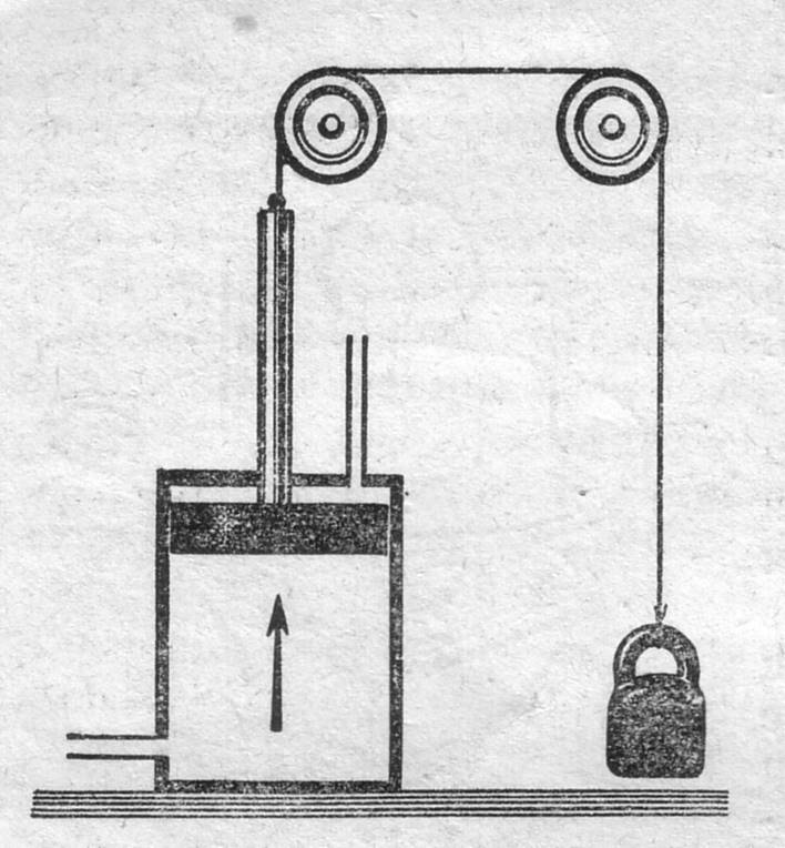 Папен построил цилиндр, в котором вверх и вниз свободно перемещался поршень. Поршень был связан тросом, перекинутым через блок, с грузом, который тоже вслед за поршнем подымался и опускался. По мысли Папена, поршень можно было связать с какой-либо машиной, например водяным насосом, который стал бы качать воду. В нижнюю, откидывающуюся часть цилиндра насыпали порох, который затем поджигали. Образовавшиеся газы, стремясь расшириться, толкали поршень вверх. После этого поршень с наружной стороны обливали холодной водой. Газы в цилиндре охлаждались, и давление их на поршень уменьшалось. Поршень под действием собственного веса и наружного атмосферного давления опускался вниз, поднимая при этом груз. Двигатель совершал полезную работу. Но для практических целей он не годился. Немыслимо было каждый раз насыпать в цилиндр порох, поджигать его, затем пускать воду, и так все время, пока двигатель работает. Кроме того, применение взрыва для поднятия поршня было далеко не безопасно.