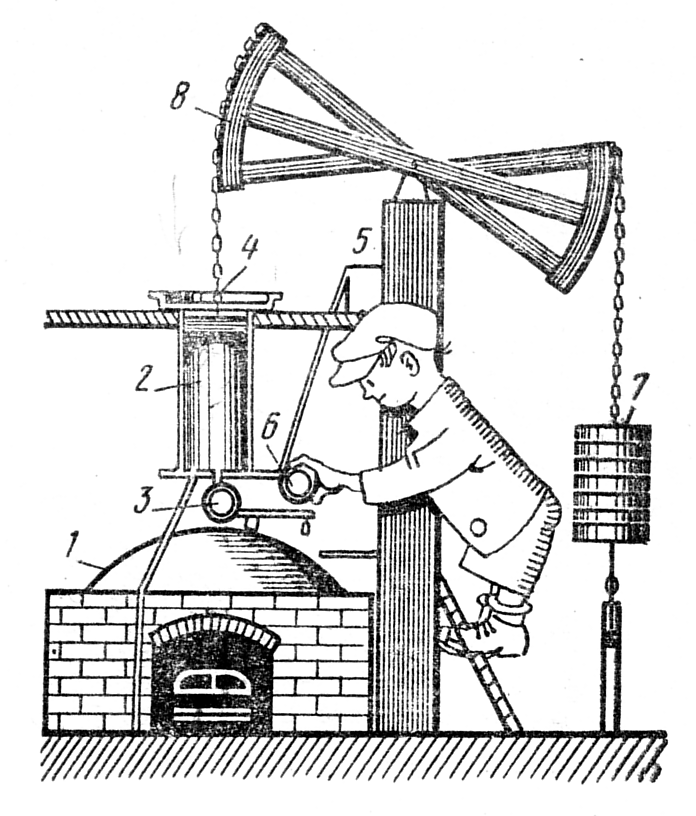 Наиболее удачной была машина, построенная англичанами Т. Нюкоменом и его помощником Коули. Их машина начала работать в 1711 г. Она приводила в движение насос. Пар получали в котле 1 (рис. 2). Когда под действием силы тяжести спускались штанга насоса и груз 7, то поднимался поршень 4, подвешенный на другом конце балансира 8, а пар из парового котла поступал в цилиндр 2. Когда поршень достигал своего высшего положения, кран 3 закрывался, из сосуда 5 через кран 6 в цилиндр вспрыскивалась холодная вода, пар конденсировался и образовывался вакуум. Атмосферное давление заставляло поршень опускаться, а груз 7 подниматься. Затем снова в цилиндр впускался пар. Машина Ньюкомена — Коули использовалась свыше 90 лет, однако она имела серьезные недостатки: КПД ее был низок, а рабочие ходы поршня машины разделялись длительными промежутками; она могла приводить в действие только насос.