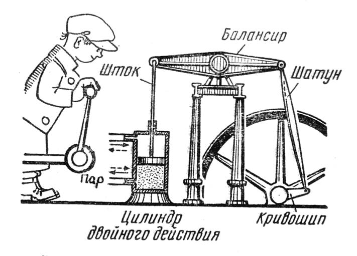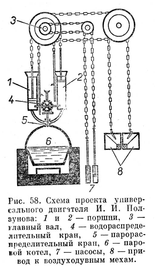 Машина Ползунова имела два цилиндра (рис. 3). Когда один из цилиндров сообщался с паровым котлом, вдругой впускалась охлаждающая вода; поршни опускались под действием атмосферного давления. В то время, как один из них опускался, под другой поступал пар, ион поднимался. Движение поршней передавалось на шкив, поэтому шкив непрерывно поворачивался то в одну, то в другую сторону. Возвратно-вращательное движение шкива могло быть преобразовано во вращение рабочего вала. Это давало возможность приво дить в движение станки и другие механизмы. Таким образом, машина Ползунова была первым в мире универсальным паровым двигателем.
