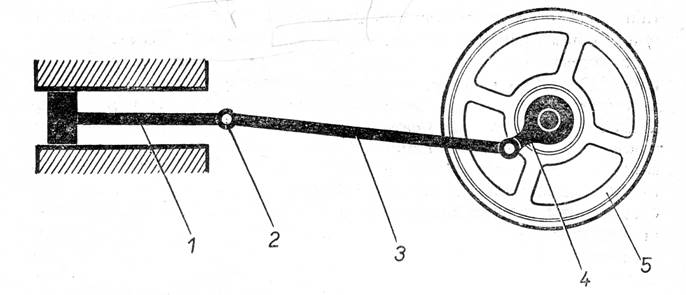 В двигателе Уатта применен так называемый кривошипно- шатунный механизм для превращения поступательно-возвратного движения поршня во вращательное движение колеса. От этого колеса вращательное движение передается любому стан ку . Кривошипно-шатунный механизм (рис. 5) состоит из шатуна 3 (шатающаяся тяга) и кривошипа 4 (кривой шип). Кривошип закреплен на валу колеса 5 и может вращаться вместе с ним. Шатун одним концом связан с балансиром 2, а другим концом — с кривошипом. Поршень 1 машины приводит в колебательное движение балансир, шатун передает это колебание кривошипу.