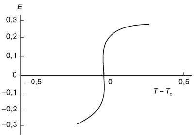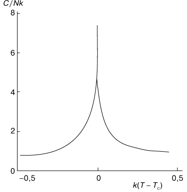 При переходах второго рода внутренняя энергия вещества и его объем не изменяются в точке перехода и, следовательно, не происходит выделения или поглощения скрытой теплоты. Однако свободная энергия системы при фазовых переходах второго рода имеет некоторую особенность, которая проявляется в том, что вторые производные - теплоемкость и сжимаемость - становятся бесконечными. Выявление характера этой особенности - одна из наиболее трудных задач статистической физики. Существует всего несколько систем, для которых эта особенность была выяснена. Одной из таких систем является двумерная модель Изинга (модель двумерного ферромагнетика), рассмотренная Л. Онсагером ]. Изменение энергии ферромагнетика в двумерной модели Изинга происходит хотя и резко, но без скачков (рис. 3). При этом теплоемкость системы обращается в бесконечность по логарифмическому закону: