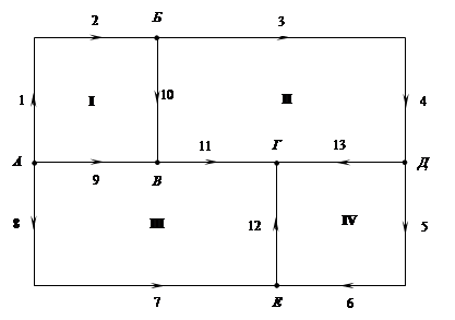 г) произвольно выбираем положительное направление токов в ветвях и контурных токов;