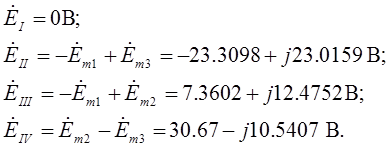 Для построения векторной диаграммы напряжений рассчитаем комплексные амплитуды напряжений на всех элементах заданного контура. Затем, выбрав положительное направление обхода контура, составим уравнение по второму закону Кирхгофа: алгебраическая сумма падений напряжений на элементах замкнутого контура равна алгебраической сумме э.д.с., действующих в этом контуре. Для II-го контура имеем: