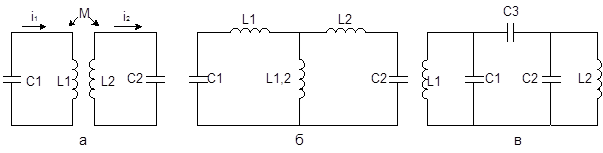 Два контура называются связанными, если колебания, происходящие в одном из них, захватывают другой контур. Связь между контурами может осуществляться через электрическое поле (благодаря емкости) или через магнитное поле (благодаря взаимоиндуктивности или индуктивности). На рис. 1 показаны три разновидности связи двух колебательных контуров: а) трансформаторная, когда связь между контурами осуществляется благодаря взаимоиндуктивности между катушками L1 и L2 ; б) автотрансформаторная , когда связь между контурами осуществляется непосредственно через индуктивность связи L1,2 ; в) емкостная , когда связь между контурами осуществляется через емкость связи С3. Наиболее часто в радиотехнике применяется трансформаторная связь, поэтому все дальнейшие выкладки проведем для этого вида связи.