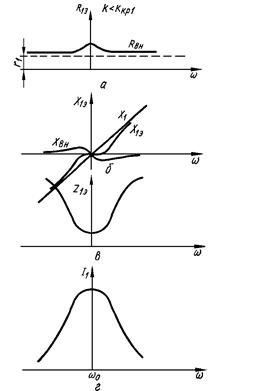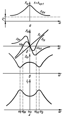 Как видно, при слабой связи между контурами вследствие малости Х ВН по сравнению с Х 1 кривая X 1э (w) пересекает ось частот только в одной точке wо . При сильной связи между контурами вследствие значительной величины ХВН , которая на некоторых частотах превышает по абсолютной величине Х 1 , имея обратный знак, суммарная кривая Х1э (w) пересекает ось частот в трех точках: w01 , w0 и w02 . Другими словами, результирующее реактивное сопротивление системы равно нулю не только на частоте w0 , но и на частотах w01 и w02 , называемых частотами связи. Учитывая еще то обстоятельство, что при сильной связи между контурами сопротивления R ВН на частоте w0 и в близлежащей области большие, чем при слабой, понятен двугорбый характер кривых Z 1э (w) и I 1 (w) с максимумами на частотах w 1 и w 2 .