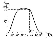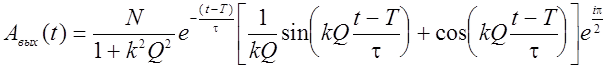 Рассмотрим теперь явления в цепи в конце импульса, начиная с момента t = T , где T – длительность импульса. Ясно, что после прекращения действия внешней силы в системе может существовать только свободное колебание. Структура этого колебания легко может быть выявлена, если прекращение импульса рассматривать как результат включения в момент t = T новой э.д.с., компенсирующей э.д.с. сигнала. Для этой компенсируещей э.д.с. решение имеет такой же вид, как и (31), но отличается только знаком, который должен быть обратным знаку правой части выражения (31), и сдвигом начала отсчета времени из нуля в точку t = T .