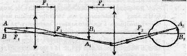Простейший микроскоп - это система с двух линз: объектива и окуляра. Предмет АВ размещается перед линзой, которая является объективом, на расстоянии F 1 < d < 2F 1 и рассматривается через окуляр, который используется как лупа. Увеличение Г микроскопа равно произведению увеличения объектива Г1 на увеличение окуляра Г2: ![]()