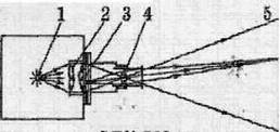 друга и воспринимаются глазом человека как подвижные изображения. В проекционном аппарате фотоснимок на прозрачной пленке размещают от объектива на расстоянии d, что удовлетворяет условию: F< d < 2F. Для освещения пленки используют электрическую лампу 1. Для концентрации светового потока применяют конденсор 2, который состоит из системы линз, которые собирают расходящиеся лучи от источника света на кадре пленки 3. С помощью объектива 4 на экране 5 получают увеличенное, прямое, действительное изображение