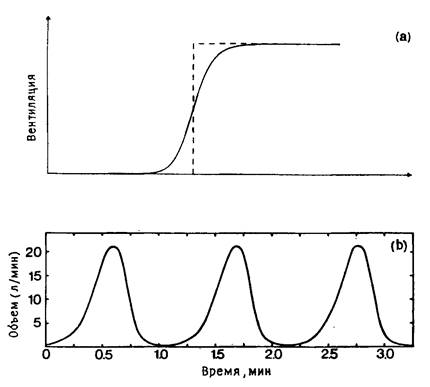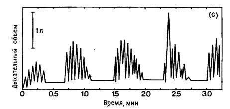 Эти наблюдения представляют интерес при рассмотрении типа дыхания, известного под названием дыхания Чейна-Стокса (рисунок 1с), при котором происходит регулярное увеличение и уменьшение вентиляции.ДыханиеЧейна-Стокса часто возникает в патологических условиях при перегрузке сердца (связанной с увеличением времени циркуляции крови от легких к хемочувствительным центрам в стволе мозга, регулирующим вентиляцию) у тучных людей (увеличенное τ) и наблюдалось также после повреждения нейронов ствола мозга (связано с повышенной чувствительностью вентиляции к СО2 , т. е. с увеличениемS*). Дыхание Чейна-Стокса вызывалось у нормальных собак искусственным удлинением артерий, что приводило к увеличению времени циркуляции.