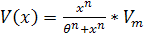 где Vm -максимальная вентиляция, а θ и n – параметры, используемые для описания кривой «чувствительности» к СО2 .Допустим также, что скорость удаления СО2 путем вентиляции пропорциональна произведению рС02 на V . Учитывая оба эти фактора, получаем
