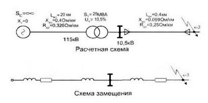 Чтобы рассчитать ток срабатывания реле КА1, КА2 и вычислить коэффициент чувствительности необходимо рассчитать ток короткого замыкания в конце кабельной линии, для этого составим схему замещения (см. рис. 5).