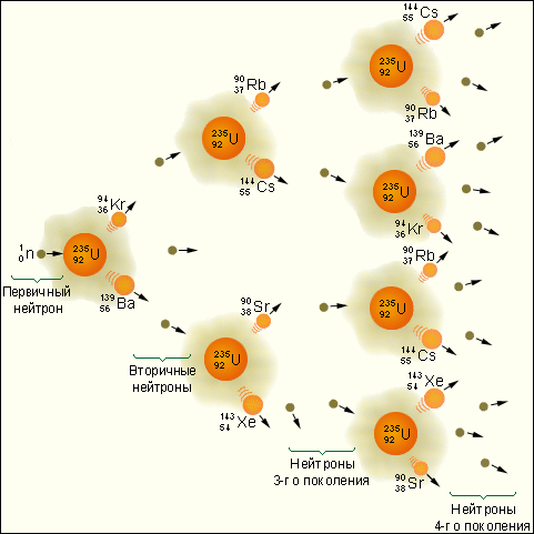 Обратите внимание, что в результате деления ядра, инициированного нейтроном, возникают новые нейтроны, способные вызвать реакции деления других ядер. Продуктами деления ядер урана-235 могут быть и другие изотопы бария, ксенона, стронция, рубидия и т. д.