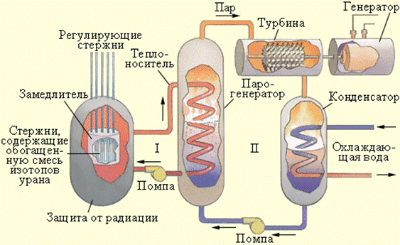 Активная зона охлаждается с помощью прокачиваемого теплоносителя, в качестве которого может применяться вода или металл с низкой температурой плавления (например, натрий, имеющий температуру плавления 98 °C). В парогенераторе теплоноситель передает тепловую энергию воде, превращая ее в пар высокого давления. Пар направляется в турбину, соединенную с электрогенератором. Из турбины пар поступает в конденсатор. Во избежание утечки радиации контуры теплоносителя I и парогенератора II работают по замкнутым циклам.