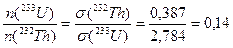 где n(. ) - плотность ядер соответствующего изотопа. Сечение деления (233 U) = 2,784 барн приведено выше, а сечение захвата нейтрона торием при тех же энергиях (232 Th) = 0,387 барн. Отсюда получаем отношение концентраций 233 U и 232 Th