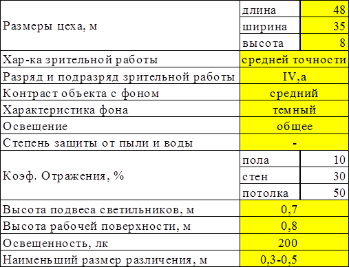 | Наим. Помещ. | Размеры помещения | Коэф. Отражения ρ | Ен, кл | Кз | N | тип светильника Вт |