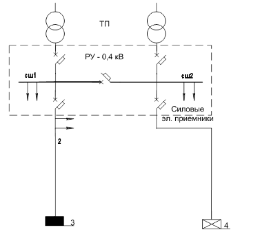 рис. 2 Схема питающей и распределительной сети освещения: 1 – питающая сеть; 2 -- распределительная сеть; 3 – групповые щитки рабочего освещения; 4 – щиток аварийного освещения.