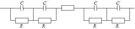Предполагается, что можно рассматривать ячейку как систему последовательно соединенных конденсаторов, обкладки которых представляют собой проводящий слой диоксида олова, слой проводящих частиц с непроводящим слоем ПАВ, проводящую среду, обусловленную возникновением объемного заряда. Эквивалентная схема ячейки: