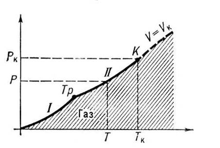 Любое вещество можно перевести в газообразное состояние надлежащим подбором давления и температуры. Поэтому возможную область существования газообразного состояния графически удобно изобразить в переменных: давление р - температура Т (в р, Т -диаграмме, рис. 1 ). При температурах ниже критической Тк эта область ограничена кривыми сублимации (возгонки) / и парообразования II. Это означает, что при любом давлении ниже критического рк существует температура Т (см. рис. 1), определяемая кривой сублимации или парообразования, выше которой вещество становится газообразным. В состояниях на кривой 1 (ниже тройной точки Tp )газ находится в равновесии с твёрдым веществом (твёрдой фазой), а на кривой II (между тройной и критической точкой К. ) - с жидкой фазой. Газ в этих состояниях обычно называют паром вещества.