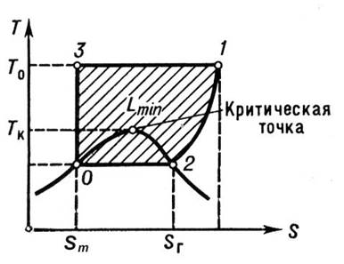 Площадь ниже 1—2—0 эквивалентна количеству теплоты, которое необходимо отвести от газа при его сжижении, а площадь внутри контура 1—2—0—3 (1—3 — изотермическое сжатие газа,