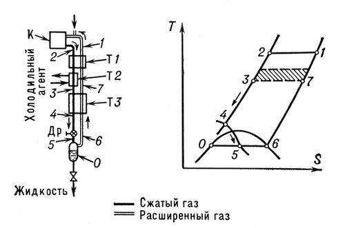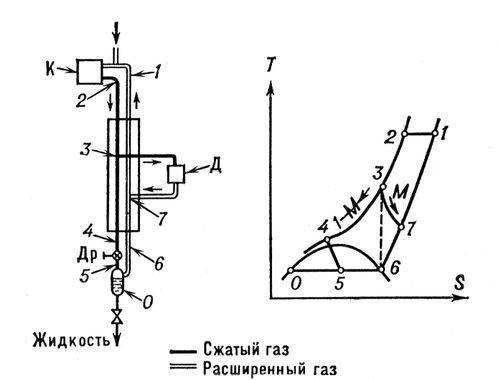 После сжатия в компрессоре (1—2 ) газ последовательно охлаждается в теплообменниках (2—3—4 ) и затем расширяется (дросселируется) в вентиле (4—5 ). При этом часть газа сжижается и скапливается в сборнике, а несжижившийся газ направляется в теплообменники и охлаждает свежие порции сжатого газа. Для сжижения газа по циклу с дросселированием необходимо, чтобы температура сжатого газа перед входом в основной теплообменник T3 была ниже температуры инверсионной точки. Для этого и служит теплообменник с посторонним холодильным агентом T2. Если температура инверсионной точки газа лежит выше комнатной (азот, аргон, кислород), то схема принципиально работоспособна и без теплообменников T1 и T2. Применение посторонних хладагентов в этих случаях имеет целью повышение выхода жидкости. Если же температура инверсионной точки газа ниже комнатной, то теплообменник с посторонним хладагентом обязателен. Например, при сжижении водорода методом дросселирования в качестве постороннего хладагента используется жидкий азот, при сжижении гелия — жидкий водород.