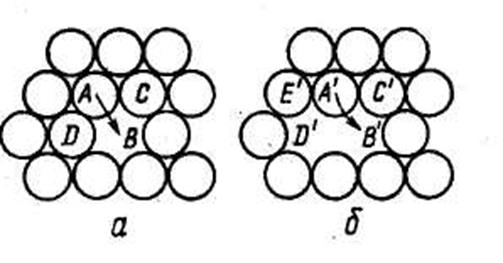 При утворенні вакансії один з центральних атомів переміщається у відповідне місце на поверхні, у випадку дивакансії А—В обидва центральні атоми заповнюють поверхневі вакансії. При утворенні комплексу «вакансія—АСД» один з центральних атомів переноситься на поверхню, а інший — на місце того, що був перенесений. Утворення ізольованого АСД моделюється шляхом переміщення центрального атома у відповідне вакантне місце з подальшим заповненням вакансії, що утворилася, чужорідним атомом з протилежної поверхні (рис. 7.3).