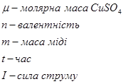 Обладнання: електролітична ванна з розчином сульфату міді, мідні електроди, джерело постійного струму, секундомір, амперметр, терези, провідники.