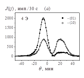 Рис. 1 соответствует одноосной магнитной текстуре: области с противоположными направлениями намагниченностей имеют большие латеральные размеры и толщину равную толщине пленки. Обоснование модели такой текстуры приведено в статье [2]. Для большей части доменов (примерно 70% объема) углы между направлениями намагниченностей и полем H равны 180°-a. Приложение внешнего магнитного поля H > Hc приводит к образованию однонаправленной текстуры (рис. 1б). Средние значения aav углов a для таких текстур: 31° (исходное состояние), 28° (H = 200 Э), 31°(H = 4 Э), 17° (H = 750 Э), 31° (H = 4 Э). Средние значения величин индукции пропорциональны угловому расстоянию D между центрами тяжестей пиков J(01) и J(10), величины которых (30, 42, 22, 49 и 33 минуты) определены с погрешностью не более одной минуты.