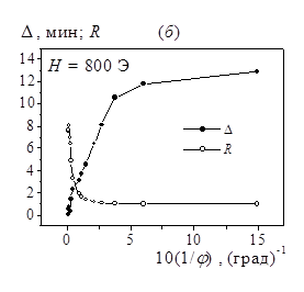 Углы aav определялись из отношений интегральных интенсивностей R = Q(11)/Q(10). Измеряемые величины aav и D могут изменяться в зависимости от толщины образца deff вдоль направления нейтронного пучка, причиной чего является многократное расщепление нейтронных волн на границах доменов. Для изучения этого эффекта на пленке и фольге сплава Co-Fe толщиной d » 25 мкм были выполнены измерения параметров D и R при разных углах j. Для пленки R » 13 при изменении deff от 30 до 100 мкм. При этом (рис. 2а) наблюдается «нормальная» линейная зависимость D(1/j). Для фольги во всем интервале углов j, начиная с 90°, происходит падение отношения R, что и приводит к наблюдаемой зависимости D(1/j). Теперь понятно, что для подтверждения указанной выше гипотезы необходимо выполнить аналогичные измерения для разных состояний магнитной текстуры.