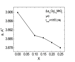 кислородом соответствует образование дефектов в катионной подрешетке. Согласно рентгеноструктурным данным исследуемые образцы − однофазные. Изменение структурного типа (от ромбоэдрического (при x=0) к псевдокубическому (x=0,1-0,25)) и монотонное уменьшение параметра кристаллической решетки (Рис.1, 2) связано с увеличением содержания ионов Ca2+