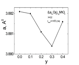 В области низких температур, порядка 90К, наблюдается рост значений магниторезистивного эффекта для составов от х=0 до 0,2 при увеличении содержания ионов Ca2+ , что связано, по-видимому, с их неравномерным распределением как внутри зерна, так и вблизи его границы. Так в работе [10] при использовании электронной микроскопии высокого разрешения обнаружено сосуществование ромбоэдрической, гексагональной и кубической «фаз» соответствующих областям, обогащенным ионами La-Sr, Lu и Sr соответственно. Выполненное комплексное исследование (рентгеноструктурным, магнитным, резистивным и ЯМР 55 Mn методами) керамических образцов манганит-лантановых перовскитов (La1-x Cax )1-у MnO3 (у, х=0 − 0,3) спеченных при температуре 11700 С позволило установить закономерности изменения: типа структуры, параметра кристалллической решетки, температуры фазового перехода “металл-полупроводник” и ”ферро-парамагнетик” и магниторезистивного эффекта с изменением состава.