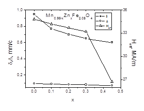 Влияние х на эффективные магнитные поля (Нэфф.), химический сдвиг (δ) и квадрупольное расщепление (Δ) по ЯГР данным иллюстрирует рис.2.