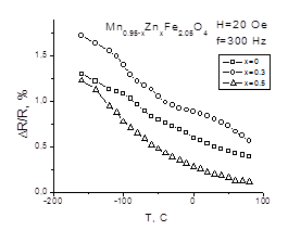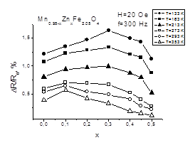 Закономерности влияния состава (x) и температуры на магниторезистивный эффект исследованных МЦФ иллюстрируют рис.3 и рис.4.