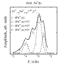 Установлено, что реальная структура феррошпинелей, в частности магнетита [6], никелевых [7] и марганец-цинковых [8] ферритов содержит катионные (V(с) ), анионные (V(а) ) вакансии и мезоскопические плоскостные дефекты кластерного типа. Примером равномерного распределения катионных вакансий в тетра (А) – позициях по данным ЯМР 57 FeB (рис.1) служат никелевые феррошпинели (Fe1-х 3+ Vх (с) )А [Ni1-х 2+ Fe2+х 3+ ]В O4 2- [7].