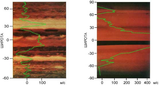 Ветра на Сатурне очень сильны. Вблизи экватора, "Вояджеры" измерили их скорость: около 500 метров в секунду. Ветра дуют, по большей части, в восточном направлении (напомним, что, как и большинство планет, Сатурн вращается с запада на восток). Сила ветров ослабевает при удалении от экватора. Также, при удалении от экватора, появляется все больше западных течений. Преобладание восточных потоков (по направлению осевого вращения) указывает на то, что ветры не ограничены слоем верхних облаков, они должны распространяться внутрь, по крайней мере, на 2 000 километров. Кроме того, измерения "Вояджера 2" показали, что ветра в южном и северном полушариях симметричны относительно экватора. Есть предположение, что симметричные потоки как-то связаны под слоем видимой атмосферы
