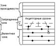 В полупроводнике с примесью, валентность которой на единицу меньше валентности основных атомов, имеется только один вид носителей тока – дырки. Такой полупроводник обладает дырочной проводимостью и является полупроводником p-типа. Атомы примеси, вызывающие появление дырок, называют акцепторами. Акцепторные уровни оказывают существенное влияние на электрические св-ва кристалла, если они расположены недалеко от потолка валентной зоны. Образованию дырки отвечает переход э-на из валентной зоны на акцепторный уровень. Обратный переход соответствует разрыву одной из четырех ковал. связей атома примесей с его соседями и рекомбинации образовавшегося при этом электрона и дырки