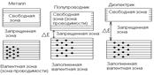 Разрешенную зону, возникшую из того уровня, на ктр. находятся валентные э-ны в осн. состоянии атома будем называть валентной зоной. В случае металла электроны заполняют валентную зону неполностью, поэтому достаточно сообщить э-нам, находящимся на верхних уровнях, совсем небольшую энергию(10-22 эВ), чтобы перевести их на более высокие уровни. В случаях полупроводника и диэлектрика уровни валентной зоны полностью заняты электронами. Для того чтобы увеличить энергию э-на необходимо сообщить ему кол-во энергии не меньшее, чем ширина запрещенной зоны. Электрическое поле сообщить такую энергии э-ну не в состоянии. Если эта ширина невелика (неск. десятых эВ), то энергии теплового движения оказывается достаточно для перевода части э-нов в верхнюю свободную зону. Эти э-ны будут нах-ся в усл-ях аналогичных тем, в ктр. находятся валентные э-ны в металле. Свободная зона окажется для них зоной проводимости. Одновременно станет возможным переход э-нов вал. зоны на ее освободившиеся верхние уровни. Такое в-во – полупроводник. Если ширина запрещенной зоны порядка неск. эВ, тепловое движение не сможет забросить в своб. зону заметное число э-нов. В этом случае кристалл – диэлектрик. |