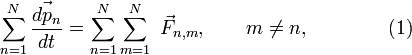 Перепишем его для системы из N частиц (где суммирование идет по всем силам, действующим на n -ю частицу со стороны m -ой):