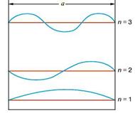 У квантовій механіці електрон не бігає в обмеженій області, як класична частинка. Якщо він замкнаний в атомі, молекулі або будь-якої потенційної ямі, то хвильова функція представляє собою стоячу хвилю. Якщо мова йде про прямокутну потенційну яму, яка зображена на рис. 2, то за своєю формою хвиля буде такою ж, як і у випадку натягнутої струни, але дискретним в цьому випадку буде не спектр частот, а спектр енергій. Стоячі хвилі, що описують електронні стани в ямі, - це синусоїди, які обертаються в точках x = 0 і x = a в нуль.