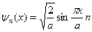 де n-номер квантового стану, a - розмір ями. На рис. 2 зображені три такі функції, відповідні n = 1, 2, 3, ... Електронна щільність у ямі розподіляється нерівномірно, є максимуми і мінімуми щільності ймовірності. З формули (1) випливає також, що довжини хвиль хвильових функцій, що описують електронні стани з різними n, задовольняють умовам
