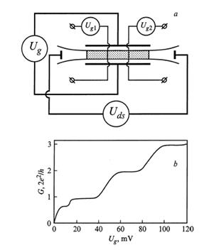 Одним з найбільш важливих наслідків отримання одновимірних балістичних каналів всередині гетероструктур GaAs-AGaAs і кремнієвих надграток стало виявлення квантування провідності в залежності від напруги на затворі, керуючого шириною квантового дроту, яке проявляється у вигляді серії одномірної провідності, розділених ступенями величиною gs gv e2 /h; де gs і gv - спіновий і частковий фактори відповідно. Зростання напруги на затворі призводить до збільшення ширини квантової дроту, тим самим стимулюючи заповнення більшої кількості підзон розмірного квантування. При цьому залежність G(Vg ) має яскраво виражений ступінчастий характер, так як кондактанс квантового дроту змінюється стрибком кожного разу, коли рівень Фермі співпадає з однією з підзон розмірного квантування: